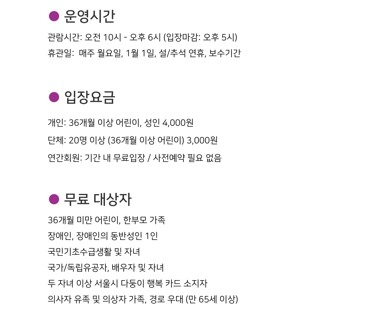 상상나라는 국가에서 운영하는 기관 답게 저렴한 입장료를 제공하며, 단체 할인과 자주 방문하는 사람들을 위한 연간 이용권을 제공합니다. 특히, 2명 이상의 다자녀 가족이 경우 무료 연간이용권 사용도 가능합니다. 운영 시간과 유지 보수 또는 특별 행사로 인한 임시 휴관 여부는 박물관 공식 웹사이트에서 확인하는 것이 좋습니다. 특히 주말이나 방학 기간에는 미리 티켓을 예약하는 것이 좋습니다.